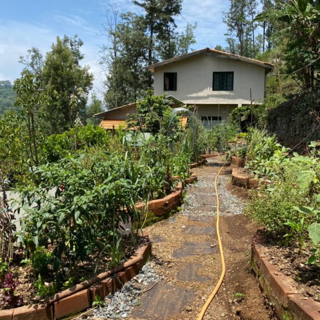 Raised vegetable and herb beds in a hillside garden at a Nilgiri tea estate, with cosmos and marigolds in bloom
